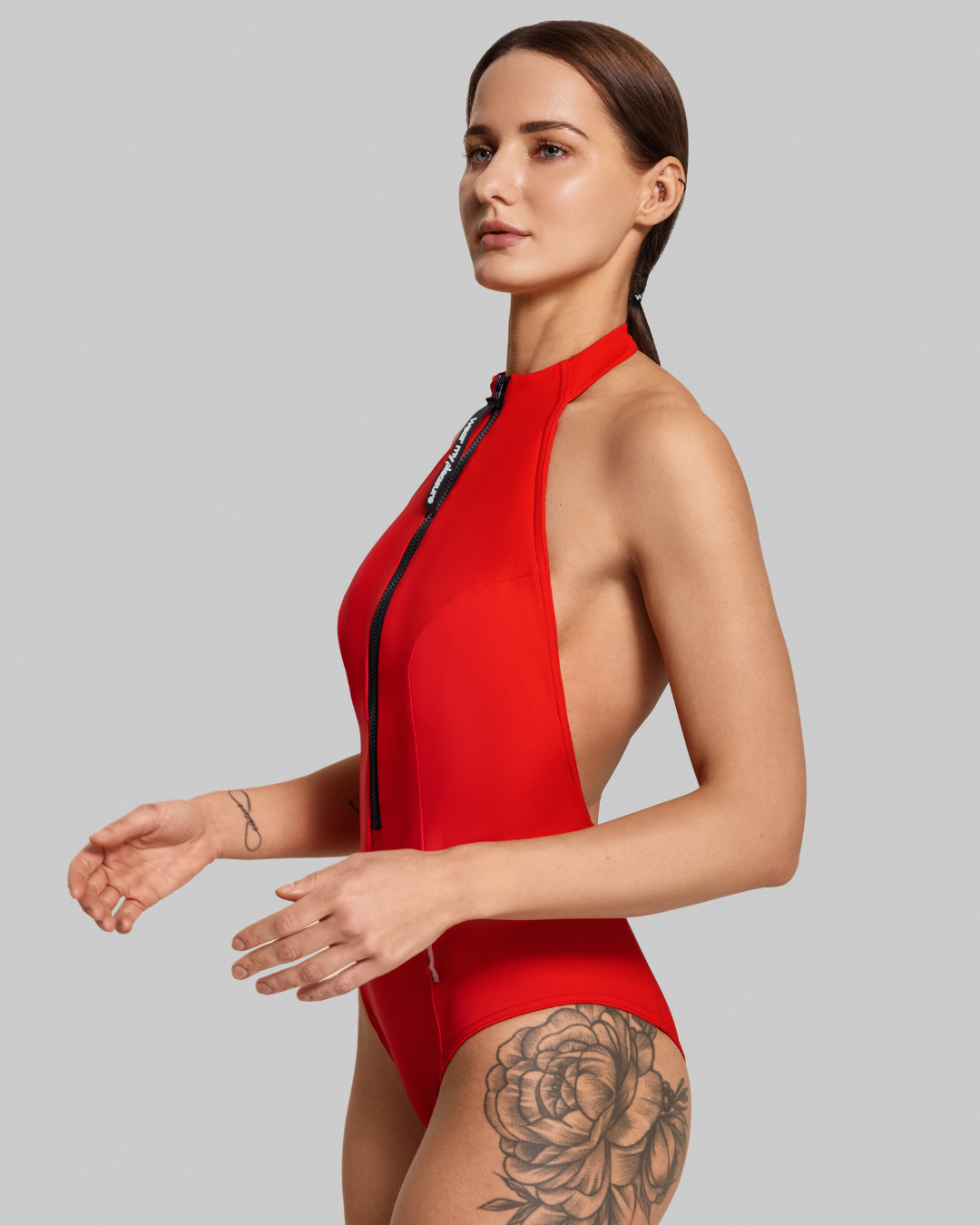Vientisas maudymukas su aukštu kakliuku, užtrauktuku ir atvira nugara – kai nori sportiško stabilumo, bet vizualiai lengvesnio, drąsesnio modelio.